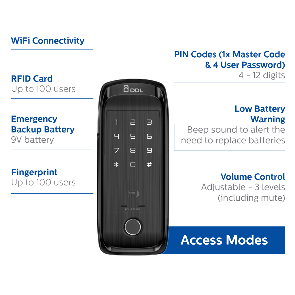 Fingerprint, Password, RFID Card, Wi-Fi Connectivity